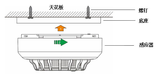 e.安装感烟报警器:将感烟报警器扣在底座上顺时针旋转,直到感烟报警器自动锁紧并固定在底座上(如图2)。