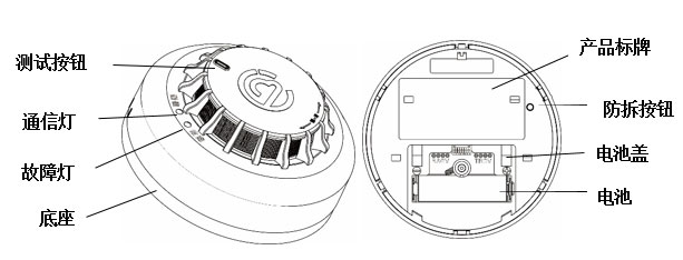 - 自检功能:感烟报警器正常监视状态下,按测试按钮3s可以进行自检。红色指示灯点亮并发出报警声,同时绿色指示灯点亮一次,表明感烟报警器功能正常。