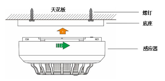 e.安装感烟报警器:将感烟报警器扣在底座上顺时针旋转,直到感烟报警器自动锁紧并固定在底座上(如图2)。