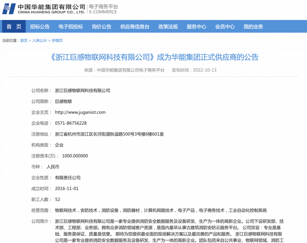 近日,中国华能集团有限公司(简称中国华能)电子商务平台发布公告,巨感物联通过一系列审核,正式成为华能集团供应商!
